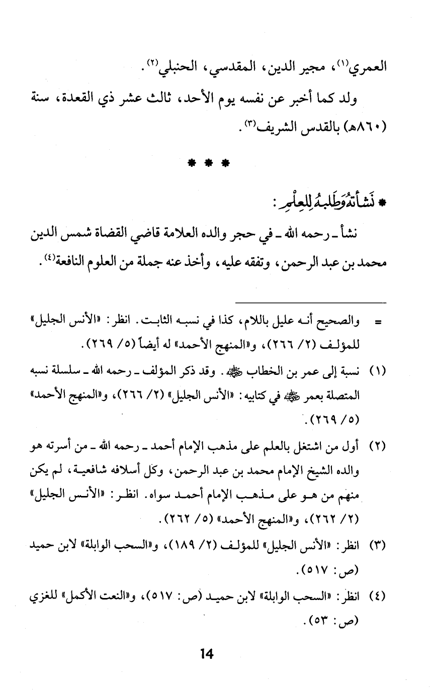 (¬1) نسبة إلى عمر بن الخطاب - رضي الله عنه -. وقد ذكر المؤلف - رحمه الله - سلسلة نسبه المتصلة بعمر - رضي الله عنه - في كتابيه: "الأنس الجليل" (2/ 266)، و"المنهج الأحمد" (5/ 269).