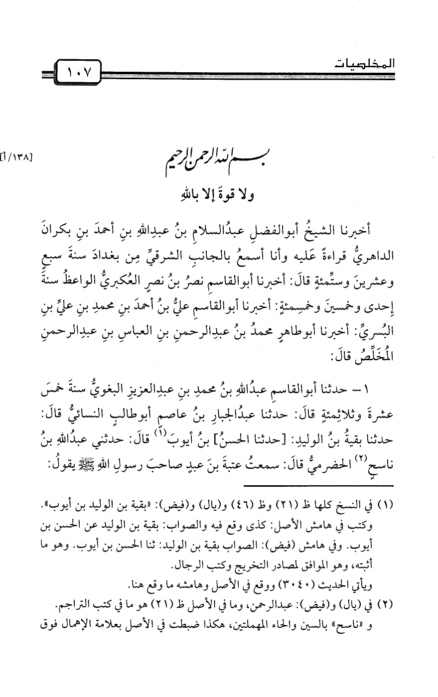 أخبرنا الشيخُ أبوالفضلِ عبدُالسلامِ بنُ عبدِاللهِ بنِ أحمدَ بنِ بكرانَ الداهريُّ قراءةً عَليه وأنا أسمعُ بالجانبِ الشرقيِّ مِن بغدادَ سنةَ سبعٍ وعشرينَ وستِّمئةٍ قالَ: أخبرنا أبوالقاسمِ نصرُ بنُ نصرٍ العُكبريُّ الواعظُ سنةَ إِحدى وخمسينَ وخمسِمئةٍ: أخبرنا أبوالقاسمِ عليُّ بنُ أحمدَ بنِ محمدِ بنِ عليِّ بنِ البُسريِّ: أخبرنا أبوطاهرٍ محمدُ بنُ عبدِالرحمنِ بنِ العباسِ بنِ عبدِالرحمنِ المُخَلِّصُ قالَ: