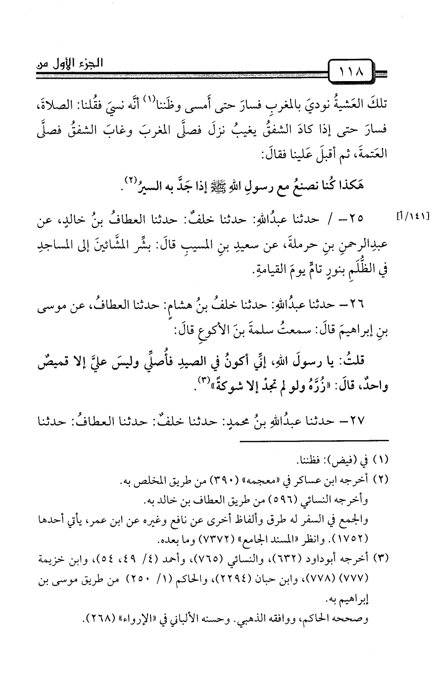 25- / حدثنا عبدُاللهِ: حدثنا خلفٌ: حدثنا العطافُ بنُ خالدٍ، عن عبدِالرحمنِ بنِ حرملةَ، عن سعيدِ بنِ المسيبِ قالَ: بشِّر المشَّائينَ إلى المساجدِ في الظُّلَمِ بنورٍ تامٍّ يومَ القيامةِ.