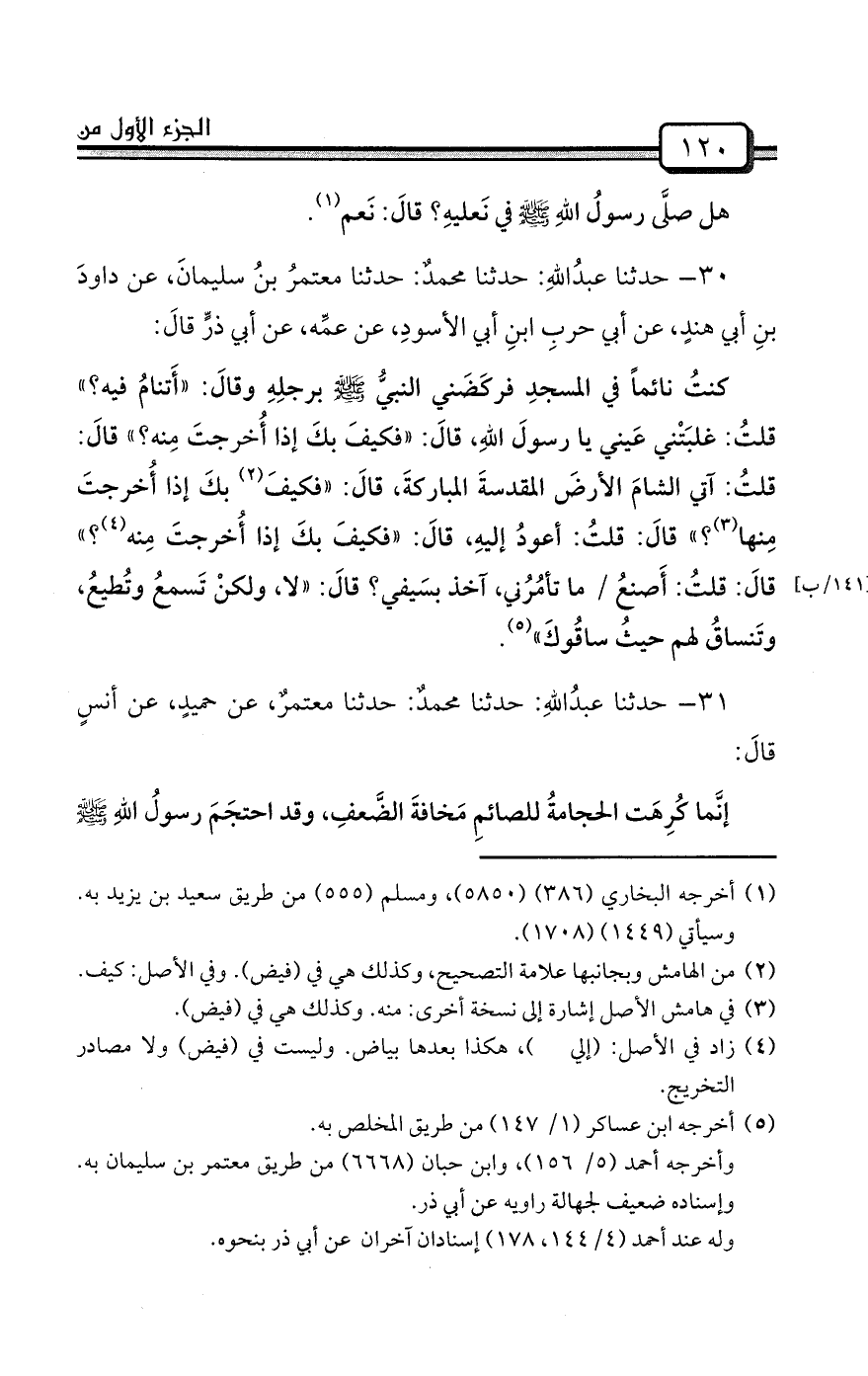 30- حدثنا عبدُاللهِ: حدثنا محمدٌ: حدثنا معتمرُ بنُ سليمانَ، عن داودَ بنِ أبي هندٍ، عن أبي حربِ ابنِ أبي الأسودِ، عن عمِّه، عن أبي ذرٍّ قالَ: