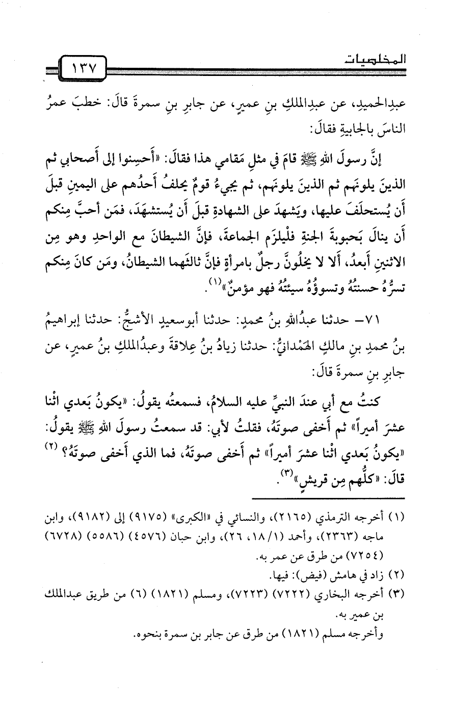 71- حدثنا عبدُاللهِ بنُ محمدٍ: حدثنا أبوسعيدٍ الأشجُّ: حدثنا إبراهيمُ بنُ محمدِ بنِ مالكٍ الهَمْدانيُّ: حدثنا زيادُ بنُ عِلاقةَ وعبدُالملكِ بنُ عميرٍ، عن جابرِ بنِ سمرةَ قالَ: