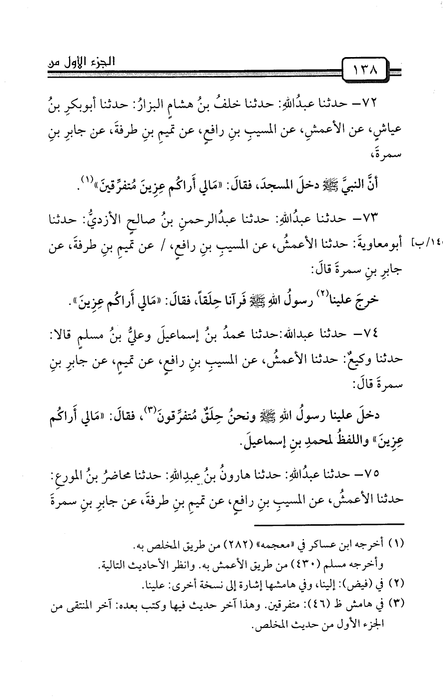 73- حدثنا عبدُاللهِ: حدثنا عبدُالرحمنِ بنُ صالحٍ الأزديُّ: حدثنا أبومعاويةَ: حدثنا الأعمشُ، عن المسيبِ بنِ رافعٍ، / عن تميمِ بنِ طرفةَ، عن جابرِ بنِ سمرةَ قالَ: