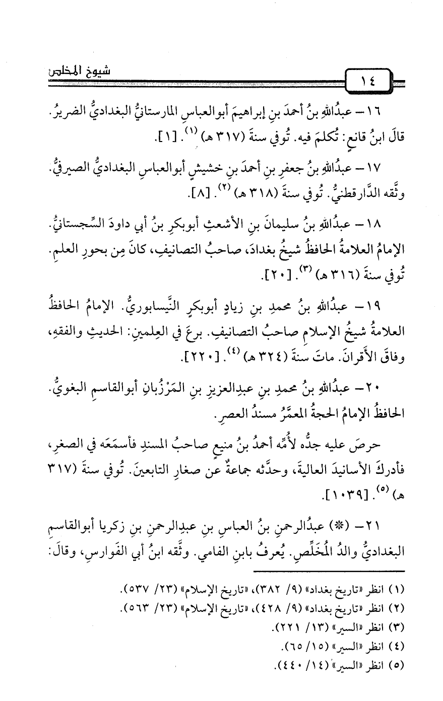 21- (*) عبدُالرحمنِ بنُ العباسِ بنِ عبدِالرحمنِ بنِ زكريا أبوالقاسمِ البغداديُّ والدُ المُخَلِّصِ. يُعرفُ بابنِ الفامي. وثَّقه ابنُ أبي الفَوارسِ، وقالَ: