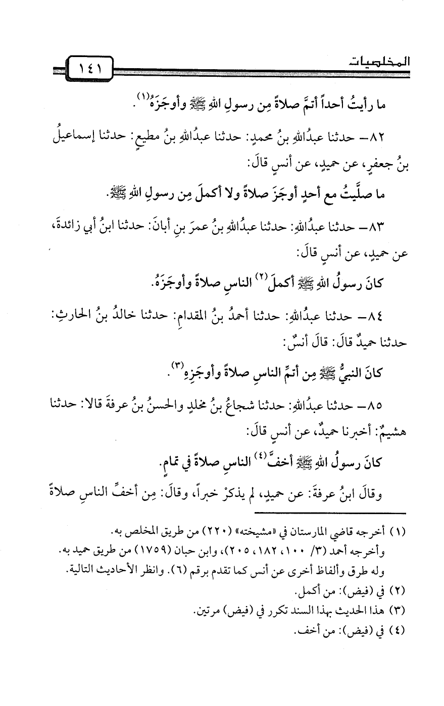 85- حدثنا عبدُاللهِ: حدثنا شجاعُ بنُ مخلدٍ والحسنُ بنُ عرفةَ قالا: حدثنا هشيمٌ: أخبرنا حميدٌ، عن أنسٍ قالَ: