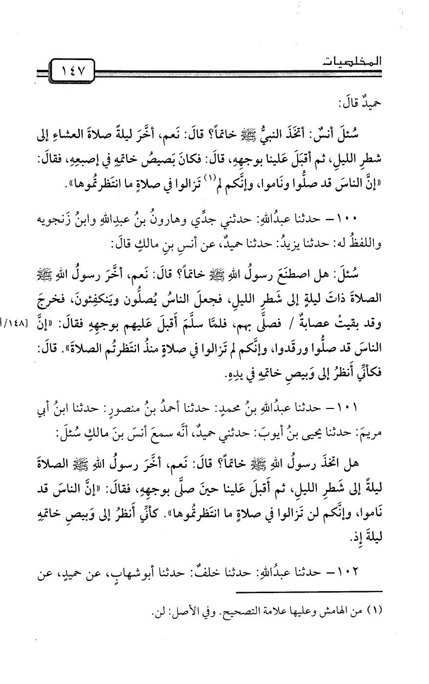 سُئلَ: هل اصطنَعَ رسولُ اللهِ صلى الله عليه وسلم خاتماً؟ قالَ: نَعم، أخَّرَ رسولُ اللهِ صلى الله عليه وسلم الصلاةَ ذاتَ ليلةٍ إلى شَطرِ الليلِ، فجعلَ الناسُ يُصلُّون ويَنكفِئونَ، فخرجَ وقد بقيتْ عصابةٌ / فصلَّى بهم، فلمَّا سلَّمَ أَقبلَ عَليهم بوجهِهِ فقالَ: «إنَّ الناسَ قد صلُّوا ورقَدوا، وإنَّكم لم تَزالوا في صلاةٍ منذُ انتَظرتُم الصلاةَ» . قالَ: فكأنِّي أَنظرُ إلى وَبيصِ خاتمِهِ في يدِهِ.