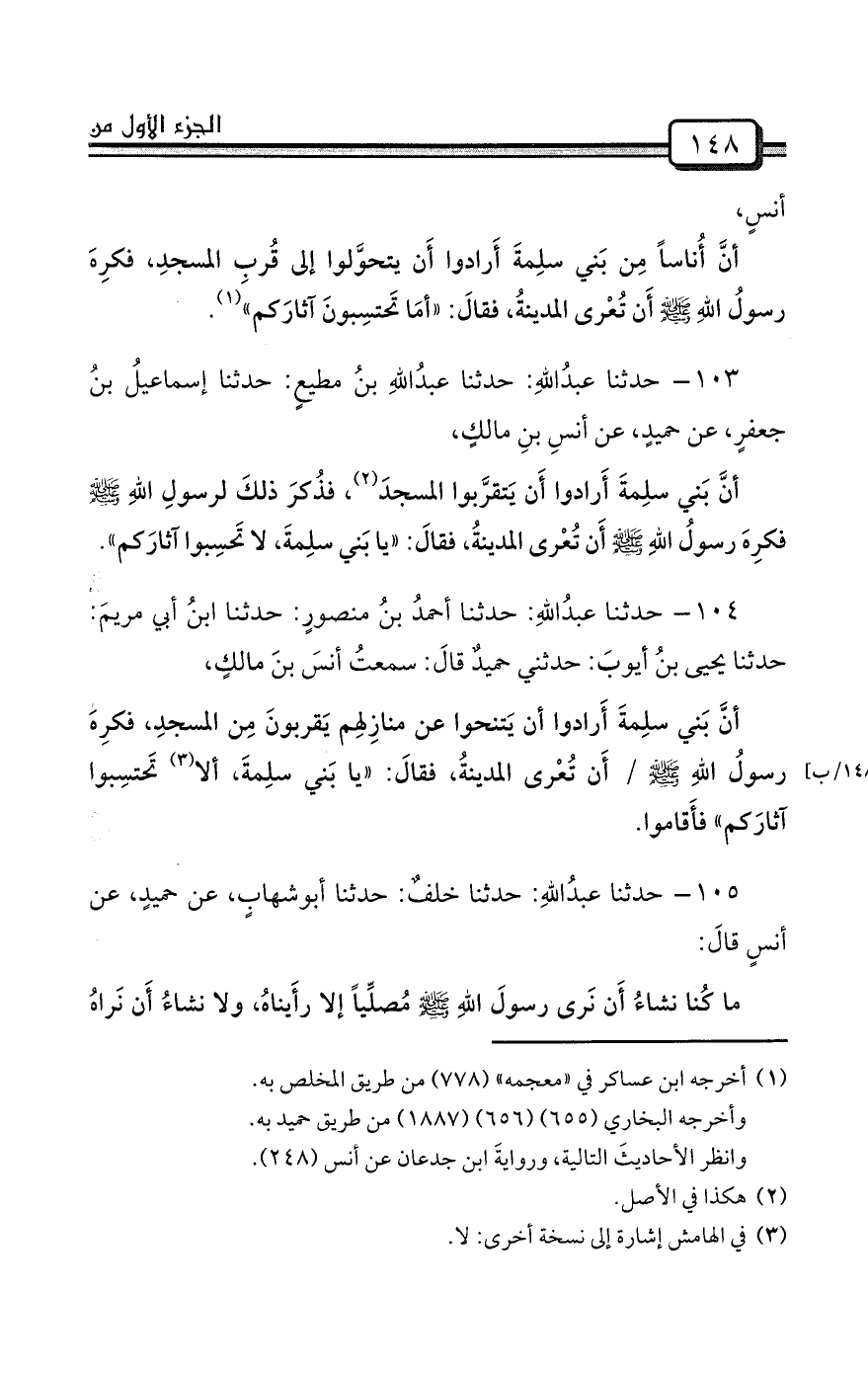 104- حدثنا عبدُاللهِ: حدثنا أحمدُ بنُ منصورٍ: حدثنا ابنُ أبي مريمَ: حدثنا يحيى بنُ أيوبَ: حدثني حميدٌ قالَ: سمعتُ أنسَ بنَ مالكٍ،