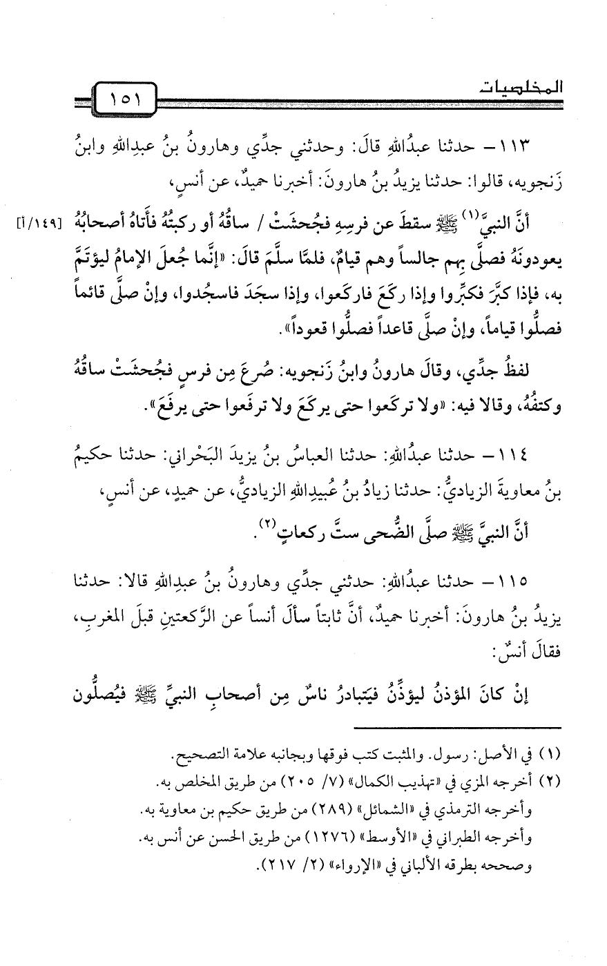 لفظُ جدِّي، وقالَ هارونُ وابنُ زَنجويه: صُرعَ مِن فرسٍ فجُحشَتْ ساقُهُ وكتفُهُ، وقالا فيه: «ولا تركَعوا حتى يركَعَ ولا ترفَعوا حتى يرفَعَ» .