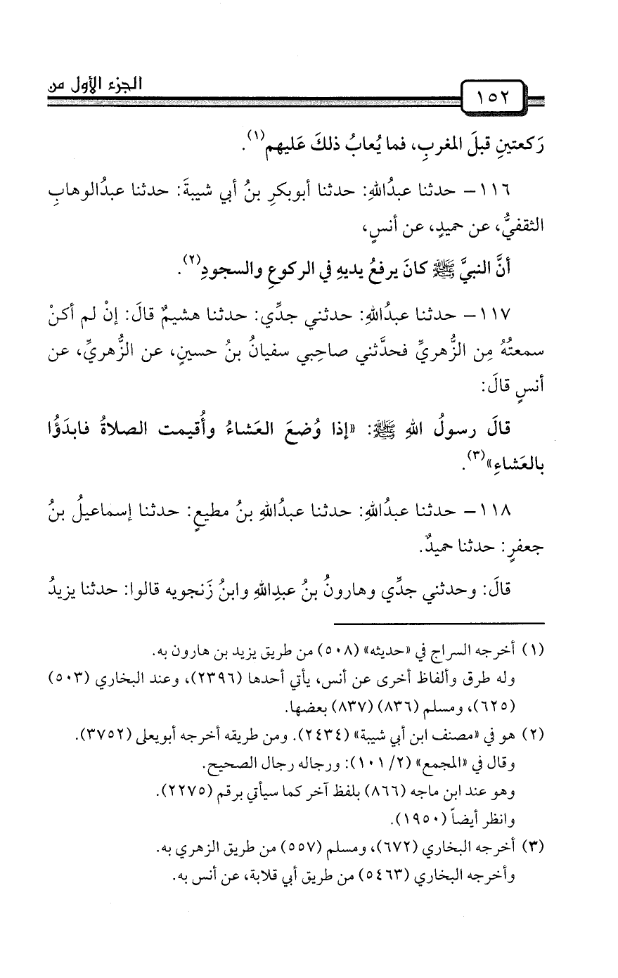 118- حدثنا عبدُاللهِ: حدثنا عبدُاللهِ بنُ مطيعٍ: حدثنا إسماعيلُ بنُ جعفرٍ: حدثنا حميدٌ.