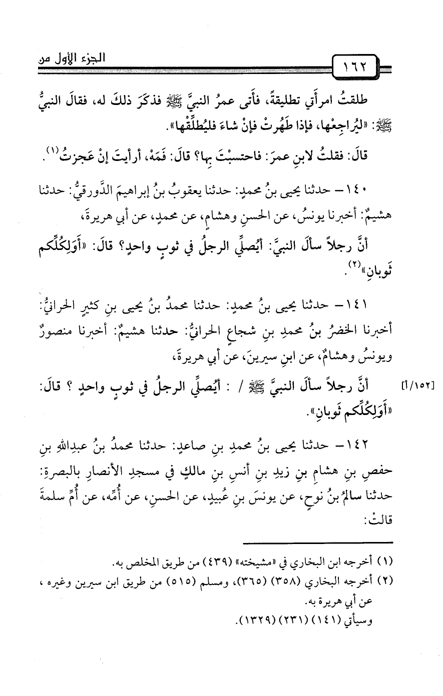 141- حدثنا يحيى بنُ محمدٍ: حدثنا محمدُ بنُ يحيى بنِ كثيرٍ الحرانيُّ: أخبرنا الخضرُ بنُ محمدِ بنِ شجاعٍ الحرانيُّ: حدثنا هشيمٌ: أخبرنا منصورٌ ويونسُ وهشامٌ، عن ابنِ سيرينَ، عن أبي هريرةَ،