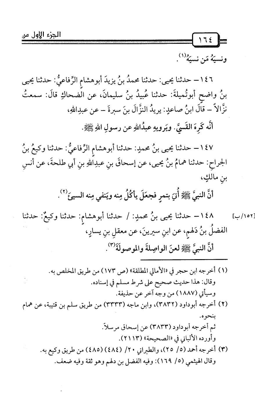 147- حدثنا يحيى بنُ محمدٍ: حدثنا أبوهشامٍ الرِّفاعيُّ: حدثنا وكيعُ بنُ الجراحِ: حدثنا همامُ بنُ يحيى، عن إسحاقَ بنِ عبدِاللهِ بنِ أبي طلحةَ، عن أنسِ بنِ مالكٍ،