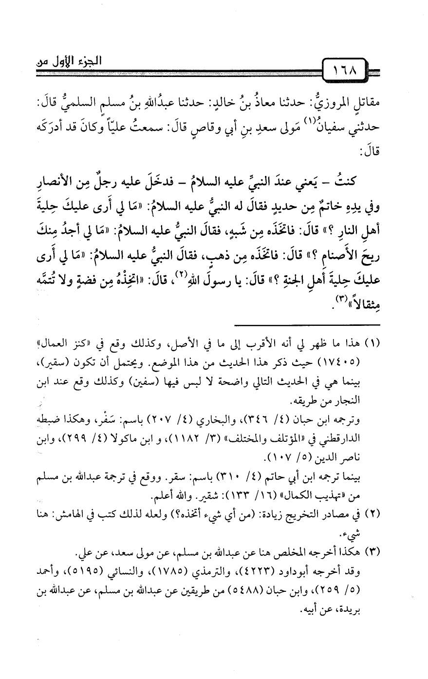 مقاتلٍ المروزيُّ: حدثنا معاذُ بنُ خالدٍ: حدثنا عبدُاللهِ بنُ مسلمٍ السلميُّ قالَ: حدثني سفيانُ (¬1) مَولى سعدِ بنِ أبي وقاصٍ قالَ: سمعتُ عليّاً وكانَ قد أدرَكَه قالَ: