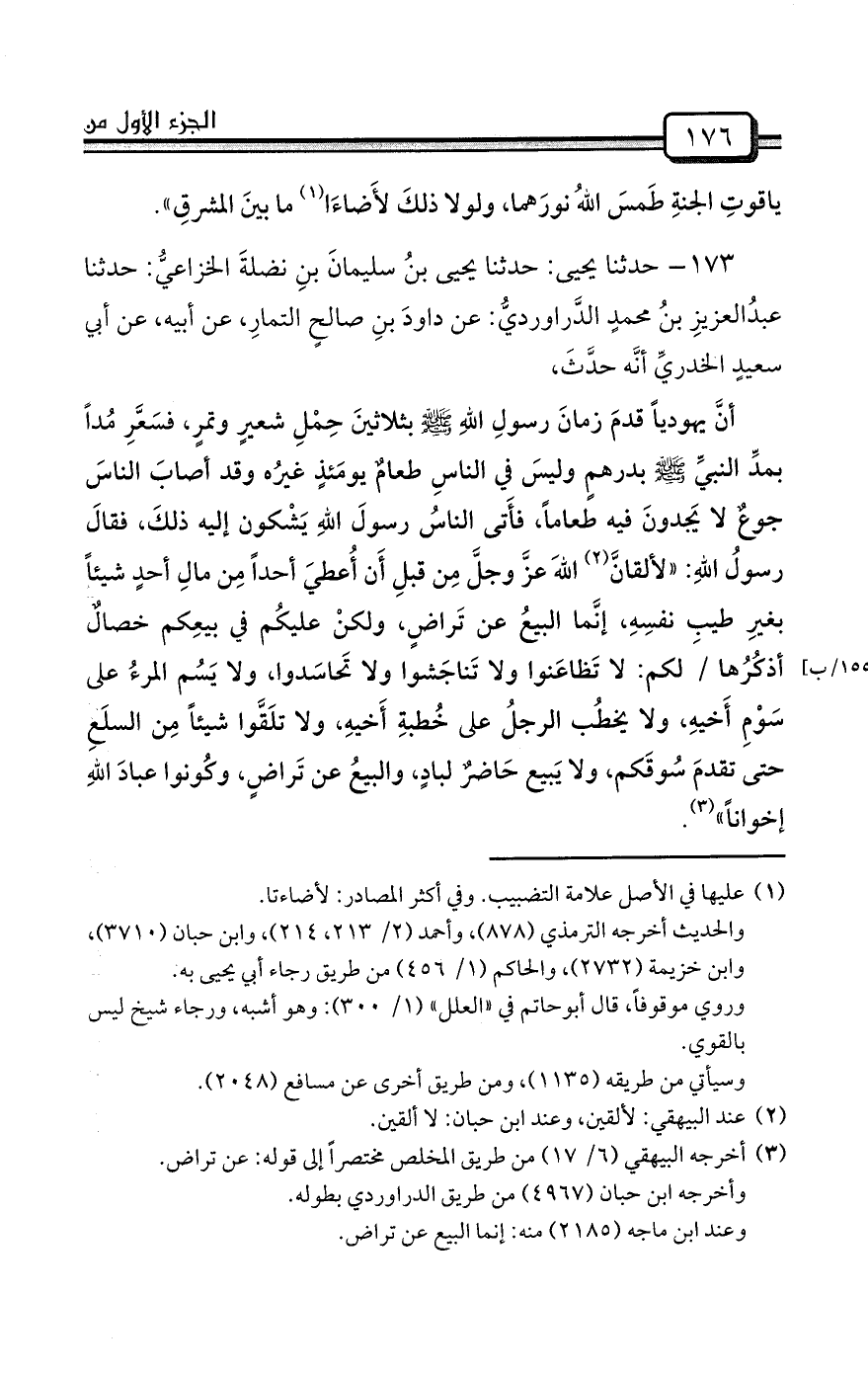 173- حدثنا يحيى: حدثنا يحيى بنُ سليمانَ بنِ نضلةَ الخزاعيُّ: حدثنا عبدُالعزيزِ بنُ محمدٍ الدَّراورديُّ: عن داودَ بنِ صالحٍ التمارِ، عن أبيه، عن أبي سعيدٍ الخدريِّ أنَّه حدَّثَ،