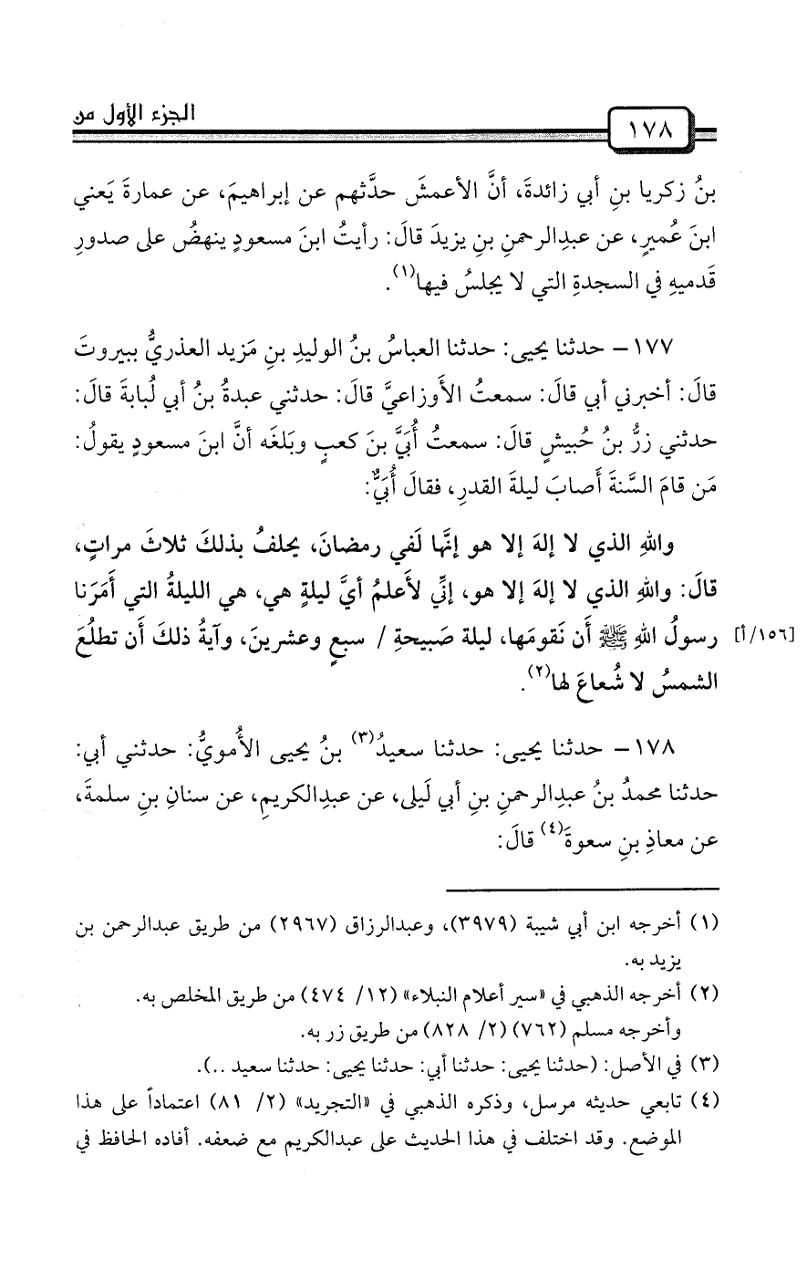 177- حدثنا يحيى: حدثنا العباسُ بنُ الوليدِ بنِ مَزيد العذريُّ ببيروتَ قالَ: أخبرني أبي قالَ: سمعتُ الأَوزاعيَّ قالَ: حدثني عبدةُ بنُ أبي لُبابةَ قالَ: حدثني زرُّ بنُ حُبيشٍ قالَ: سمعتُ أُبَيَّ بنَ كعبٍ وبَلغَه أنَّ ابنَ مسعودٍ يقولُ: مَن قامَ السَّنةَ أَصابَ ليلةَ القدرِ، فقالَ أُبَيٌّ: