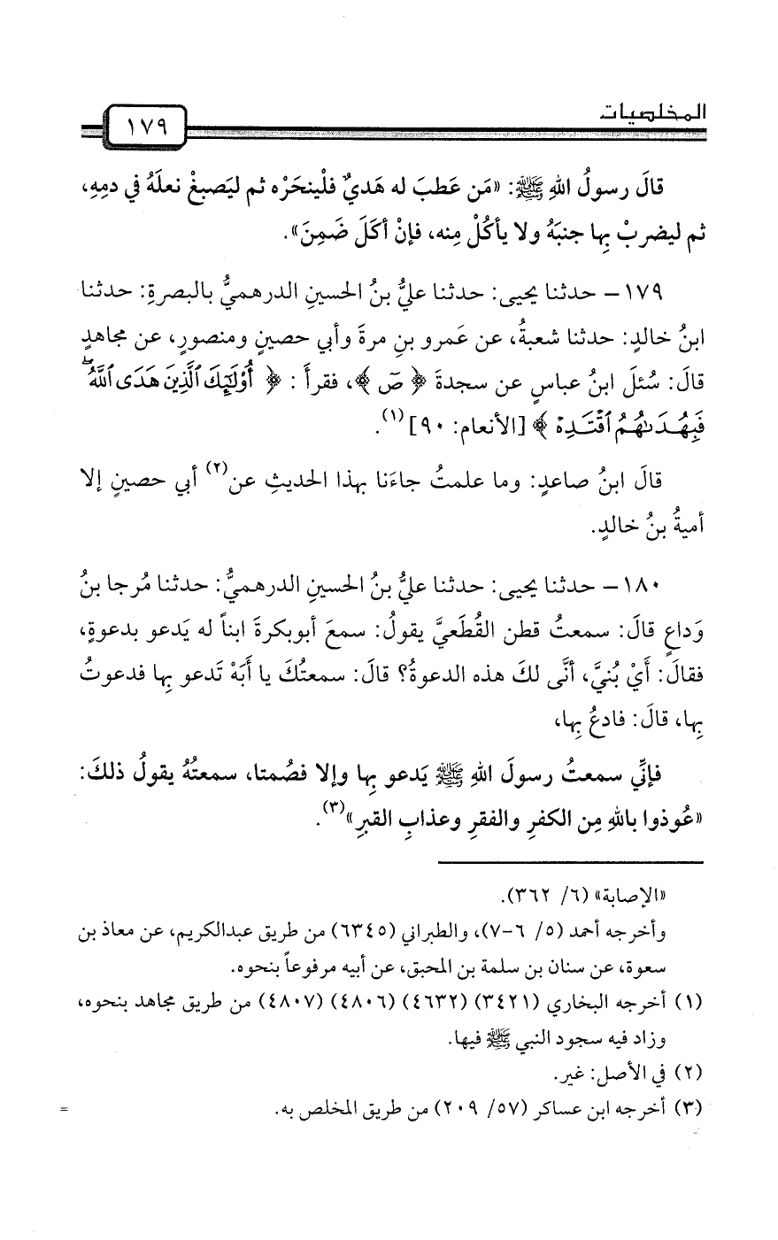 179- حدثنا يحيى: حدثنا عليُّ بنُ الحسينِ الدرهميُّ بالبصرةِ: حدثنا ابنُ خالدٍ: حدثنا شعبةُ، عن عَمرو بنِ مرةَ وأبي حصينٍ ومنصورٍ، عن مجاهدٍ قالَ: سُئلَ ابنُ عباسٍ عن سجدةَ {ص} ، فقرأَ: {أُوْلَئِكَ الَّذِينَ هَدَى اللهُ فَبِهُدَاهُمُ اقْتَدِهْ} [الأنعام: 90] (¬1) .