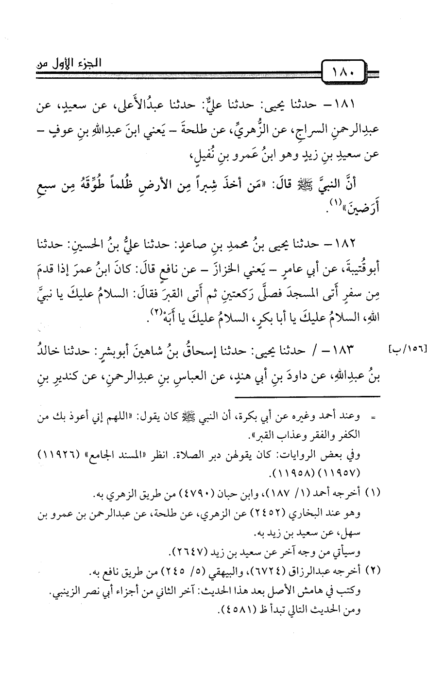 181- حدثنا يحيى: حدثنا عليٌّ: حدثنا عبدُالأَعلى، عن سعيدٍ، عن عبدِالرحمنِ السراجِ، عن الزُّهريِّ، عن طلحةَ - يَعني ابنَ عبدِاللهِ بنِ عوفٍ - عن سعيدِ بنِ زيدٍ وهو ابنُ عَمرو بنِ نُفيلٍ،