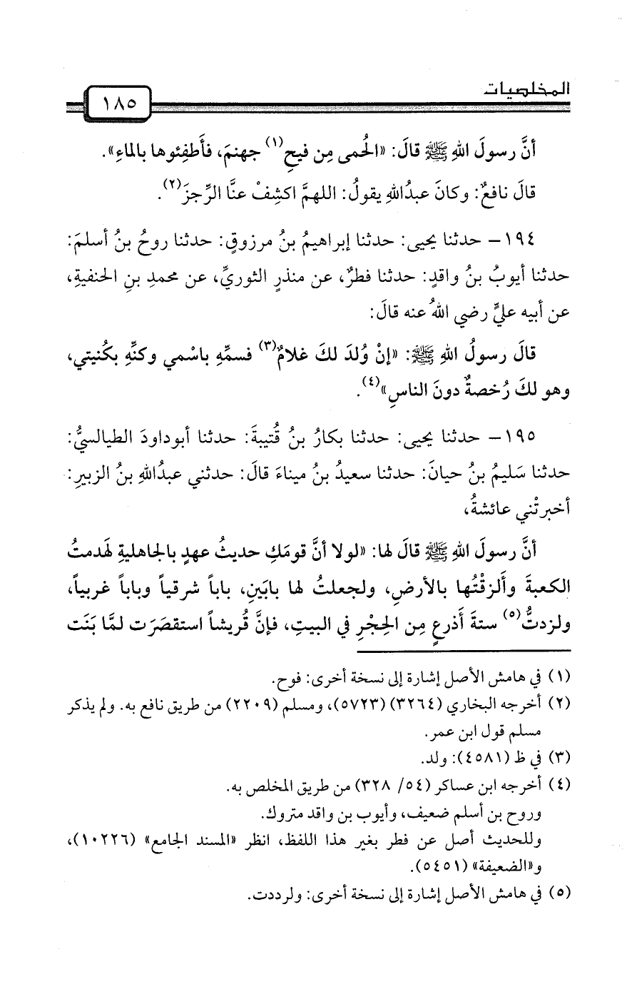 195- حدثنا يحيى: حدثنا بكارُ بنُ قُتيبةَ: حدثنا أبوداودَ الطيالسيُّ: حدثنا سَليمُ بنُ حيانَ: حدثنا سعيدُ بنُ ميناءَ قالَ: حدثني عبدُاللهِ بنُ الزبيرِ: أخبرتْني عائشةُ،