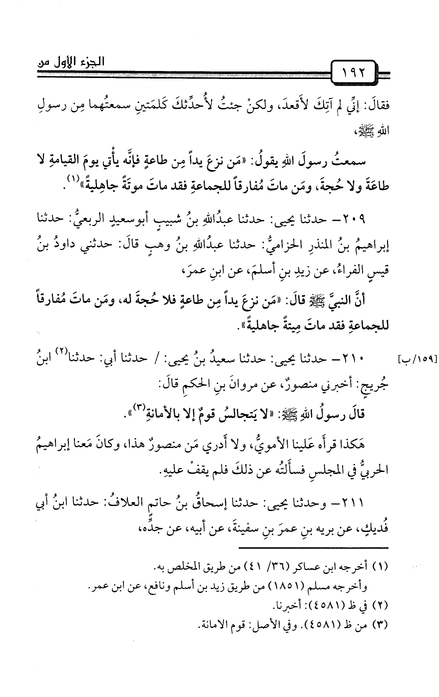 209- حدثنا يحيى: حدثنا عبدُاللهِ بنُ شبيبٍ أبوسعيدٍ الربعيُّ: حدثنا إبراهيمُ بنُ المنذرِ الحزاميُّ: حدثنا عبدُاللهِ بنُ وهبٍ قالَ: حدثني داودُ بنُ قيسٍ الفراءُ، عن زيدِ بنِ أسلمَ، عن ابنِ عمرَ،
