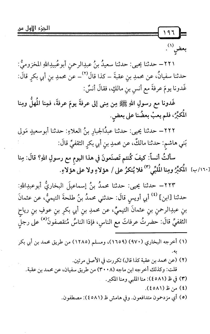221- حدثنا يحيى: حدثنا سعيدُ بنُ عبدِالرحمنِ أبوعُبيدِاللهِ المخزوميُّ: حدثنا سفيانُ، عن محمدِ بنِ عقبةَ - كذا قالَ (¬2) - عن محمدِ بنِ أبي بكرٍ قالَ: غَدونا يومَ عرفةَ مع أنسِ بنِ مالكٍ، فقالَ أنسٌ:
