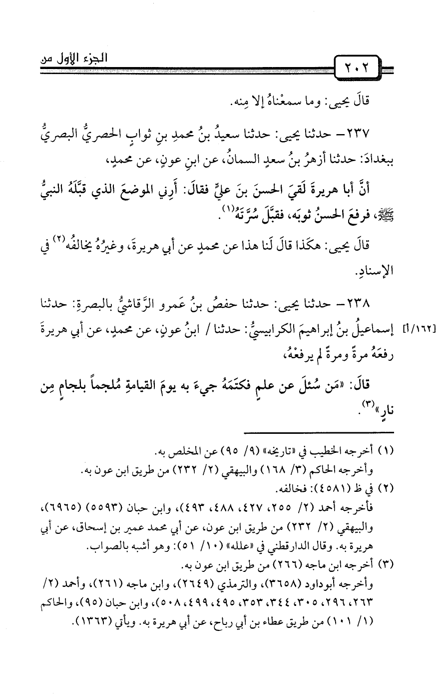 238- حدثنا يحيى: حدثنا حفصُ بنُ عَمرو الرَّقاشيُّ بالبصرةِ: حدثنا إسماعيلُ بنُ إبراهيمَ الكرابيسيُّ: حدثنا / ابنُ عونٍ، عن محمدٍ، عن أبي هريرةَ رفعَهُ مرةً ومرةً لم يرفعْهُ،