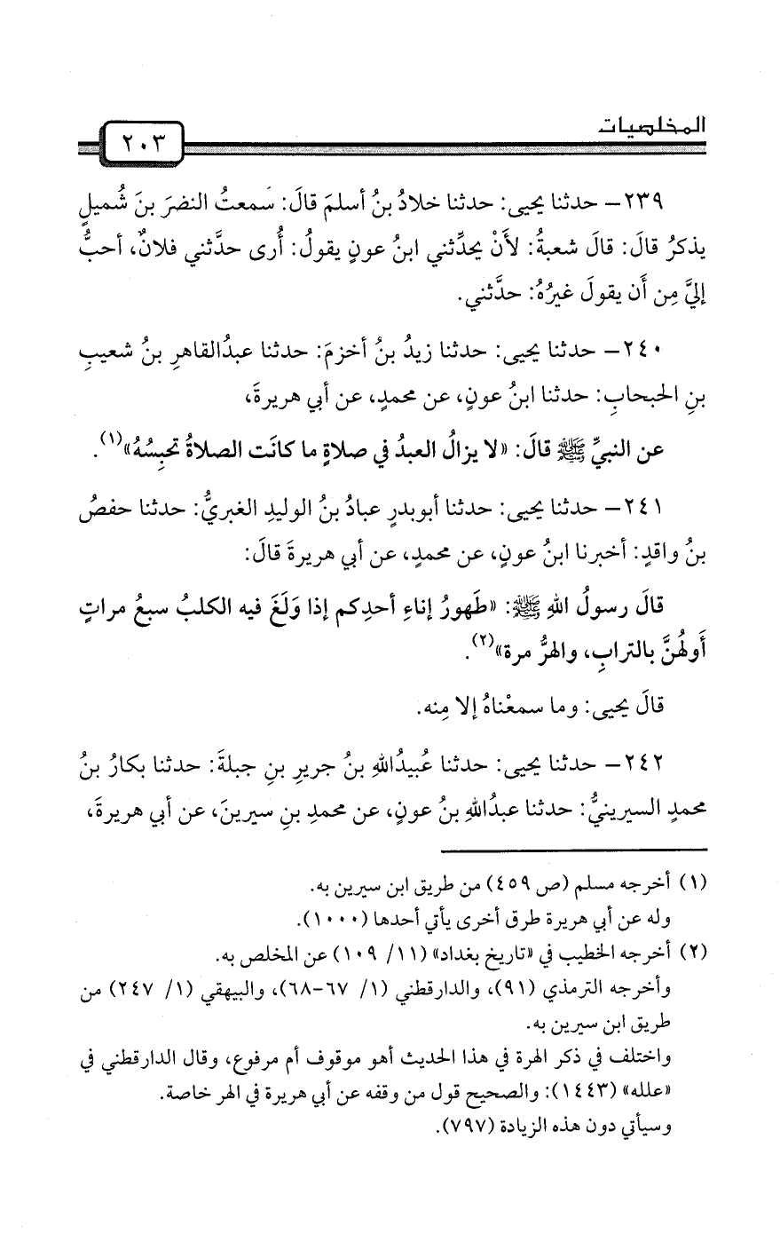 240- حدثنا يحيى: حدثنا زيدُ بنُ أخزمَ: حدثنا عبدُالقاهرِ بنُ شعيبِ بنِ الحبحابِ: حدثنا ابنُ عونٍ، عن محمدٍ، عن أبي هريرةَ،