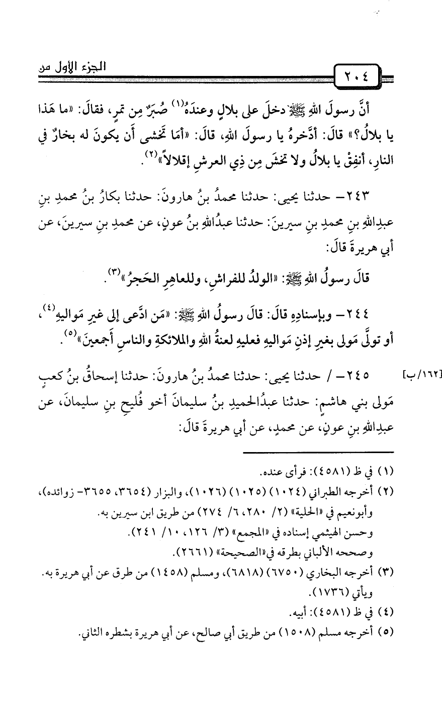 245- / حدثنا يحيى: حدثنا محمدُ بنُ هارونَ: حدثنا إسحاقُ بنُ كعبٍ مَولى بني هاشمٍ: حدثنا عبدُالحميدِ بنُ سليمانَ أخو فُليحِ بنِ سليمانَ، عن عبدِاللهِ بنِ عونٍ، عن محمدٍ، عن أبي هريرةَ قالَ: