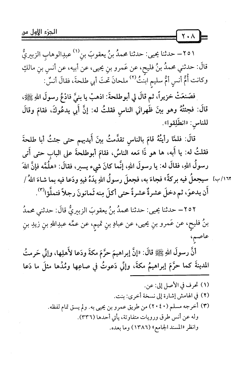 251- حدثنا يحيى: حدثنا محمدُ بنُ يعقوبَ بنِ (¬1) عبدِالوهابِ الزبيريُّ قالَ: حدثني محمدُ بنُ فليحٍ، عن عَمرو بنِ يحيى، عن أبيه، عن أنسِ بنِ مالكٍ وكانت أُمُّ أنسٍ أمُّ سليمٍ ابنتُ (¬2) ملحانَ تحتَ أبي طلحةَ، فقالَ أنسٌ: