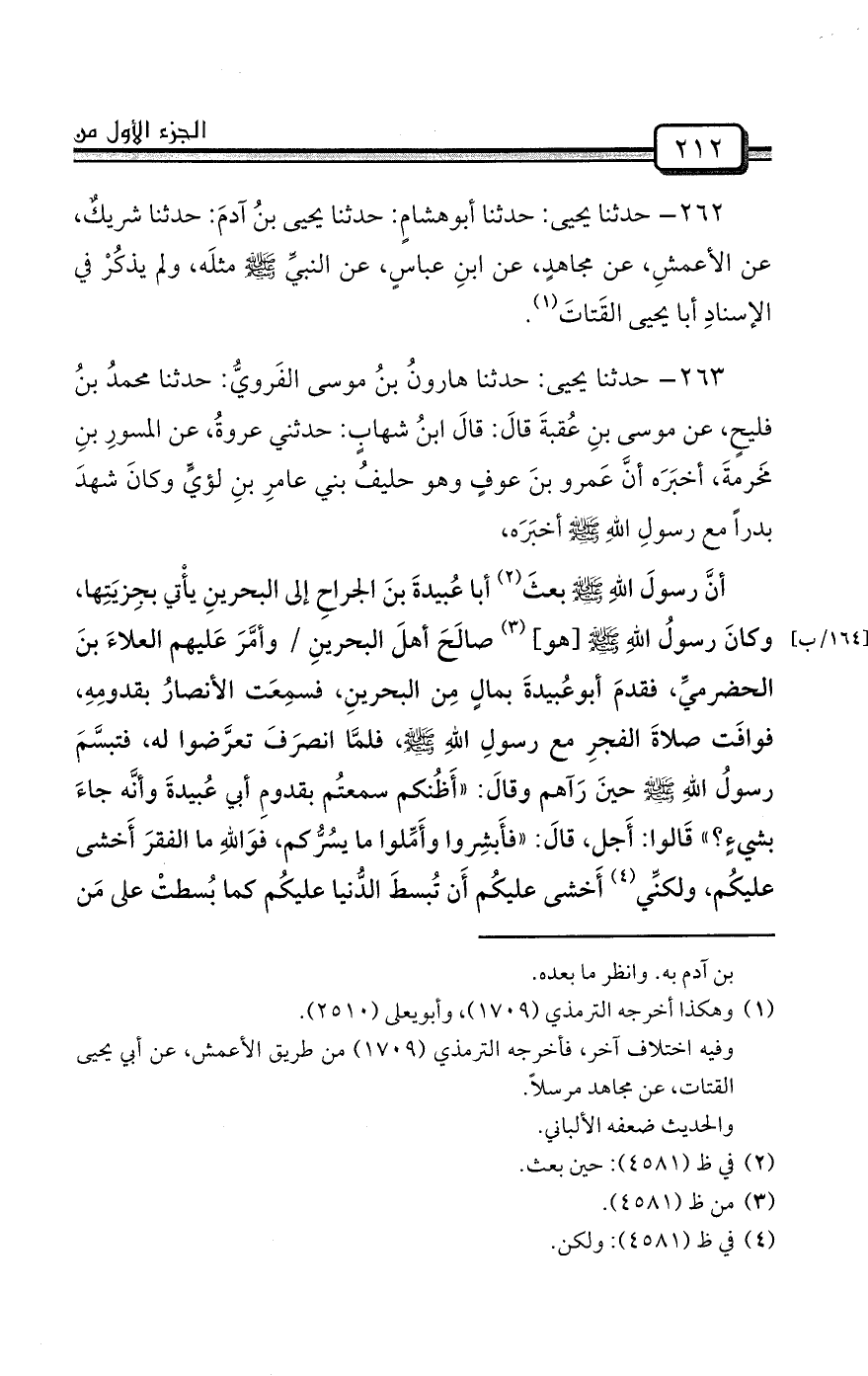 أنَّ رسولَ اللهِ صلى الله عليه وسلم بعثَ (¬2) أبا عُبيدةَ بنَ الجراحِ إلى البحرينِ يأْتي بجِزيَتِها، وكانَ رسولُ اللهِ صلى الله عليه وسلم [هو] (¬3) صالَحَ أهلَ البحرينِ / وأمَّرَ عَليهم العلاءَ بنَ الحضرميِّ، فقدمَ أبوعُبيدةَ بمالٍ مِن البحرينِ، فسمِعَت الأنصارُ بقدومِهِ، فوافَت صلاةَ الفجرِ مع رسولِ اللهِ صلى الله عليه وسلم، فلمَّا انصرَفَ تعرَّضوا له، فتبسَّمَ رسولُ اللهِ صلى الله عليه وسلم حينَ رَآهم وقالَ: «أَظُنكم سمعتُم بقدومِ أبي عُبيدةَ وأنَّه جاءَ بشيءٍ؟» قَالوا: أَجل، قالَ: «فأَبشِروا وأَمِّلوا ما يسُرُّكم، فوَاللهِ ما الفقرَ أَخشى عليكُم، ولكنِّي (¬4) أَخشى عليكُم أَن تُبسطَ الدُّنيا عليكُم كما بُسطتْ على مَن