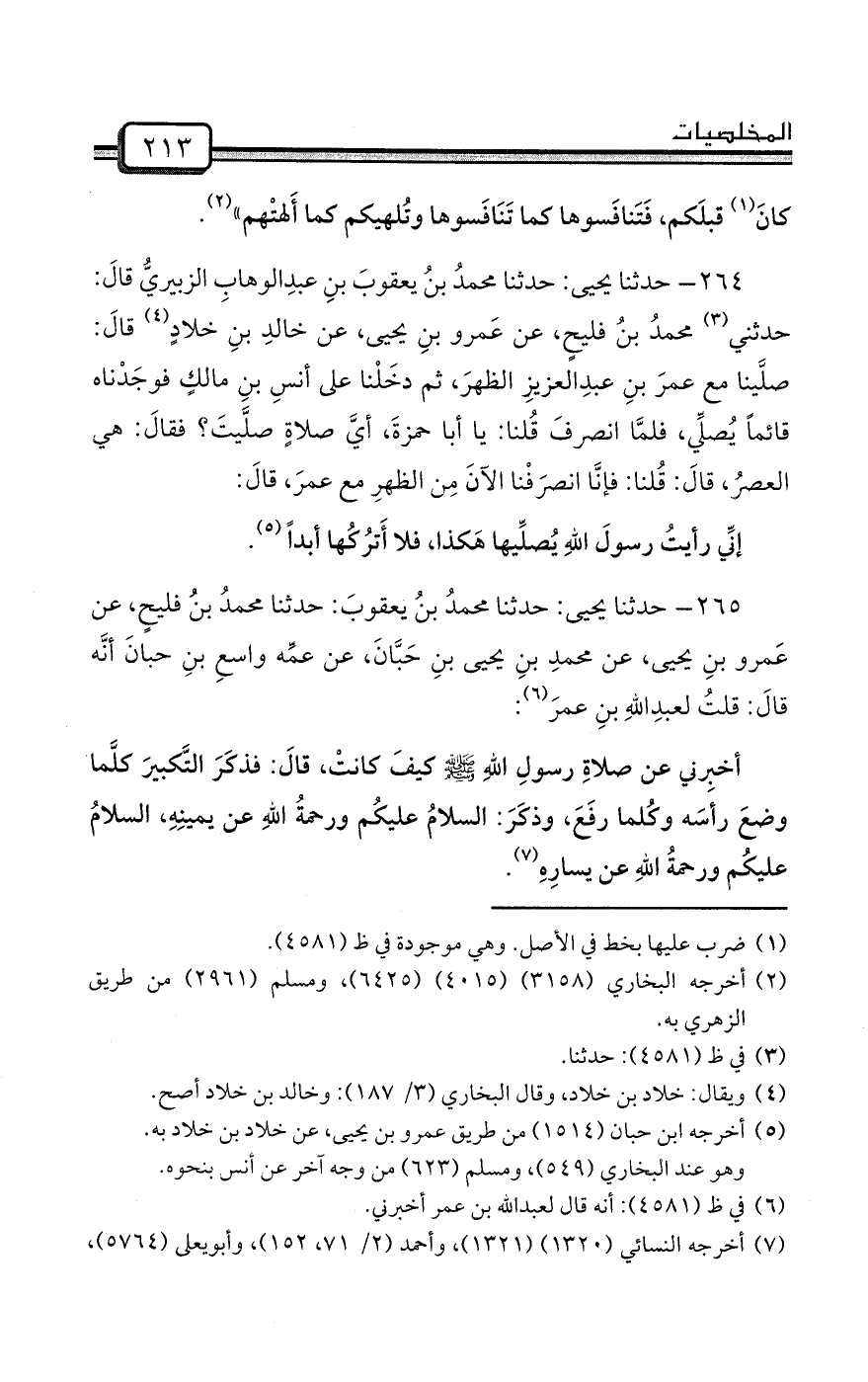 264- حدثنا يحيى: حدثنا محمدُ بنُ يعقوبَ بنِ عبدِالوهابِ الزبيريُّ قالَ: حدثني (¬3) محمدُ بنُ فليحٍ، عن عَمرو بنِ يحيى، عن خالدِ بنِ خلادٍ (¬4) قالَ: صلَّينا مع عمرَ بنِ عبدِالعزيزِ الظهرَ، ثم دخَلْنا على أنسِ بنِ مالكٍ فوجَدْناه قائماً يُصلِّي، فلمَّا انصرفَ قُلنا: يا أبا حمزةَ، أيَّ صلاةٍ صلَّيتَ؟ فقالَ: هي العصرُ، قالَ: قُلنا: فإنَّا انصرَفْنا الآنَ مِن الظهرِ مع عمرَ، قالَ: