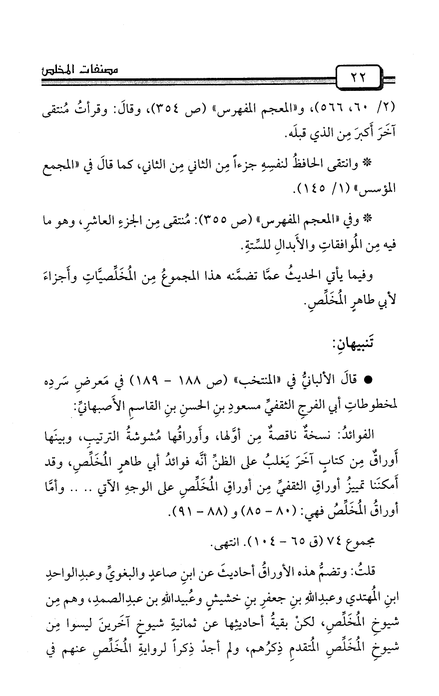 * قالَ الألبانيُّ في «المنتخب» (ص 188 - 189) في مَعرضِ سَردِه لمخطوطاتِ أبي الفرجِ الثقفيِّ مسعودِ بنِ الحسنِ بنِ القاسمِ الأَصبهانيِّ: