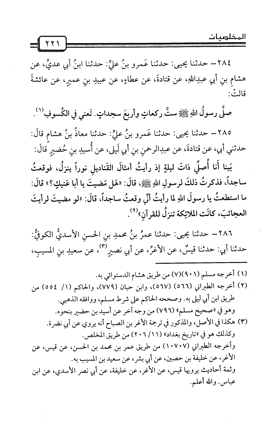 285- حدثنا يحيى: حدثنا عَمرو بنُ عليٍّ: حدثنا معاذُ بنُ هشامٍ قالَ: حدثني أبي، عن قتادةَ، عن عبدِالرحمنِ بنِ أبي لَيلى، عن أُسيدِ بنِ حُضيرٍ قالَ: