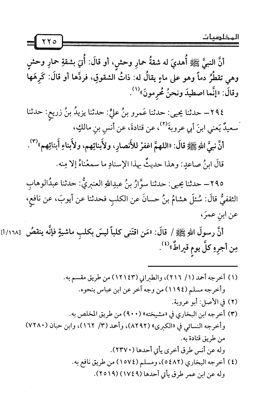 295- حدثنا يحيى: حدثنا سوَّارُ بنُ عبدِاللهِ العنبريُّ: حدثنا عبدُالوهابِ الثقفيُّ قالَ: سُئلَ هشامُ بنُ حسانَ عن الكلبِ فحدثنا عن أيوبَ، عن نافعٍ، عن ابنِ عمرَ،