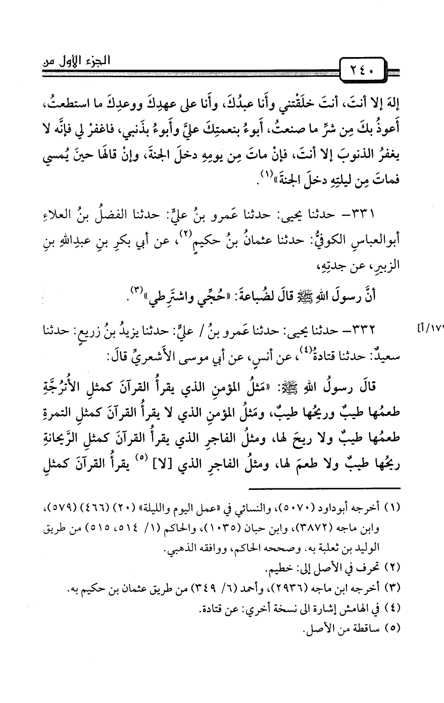 قالَ رسولُ اللهِ صلى الله عليه وسلم: «مَثلُ المؤمنِ الذي يقرأُ القرآنَ كمثلِ الأُترُجَّةِ طعمُها طيبٌ وريحُها طيبٌ، ومَثلُ المؤمنِ الذي لا يقرأُ القرآنَ كمثلِ التمرةِ طعمُها طيبٌ ولا ريحَ لها، ومثلُ الفاجرِ الذي يقرأُ القرآنَ كمثلِ الرَّيحانةِ ريحُها طيبٌ ولا طعمَ لها، ومثلُ الفاجرِ الذي [لا] (¬5) يقرأُ القرآنَ كمثلِ