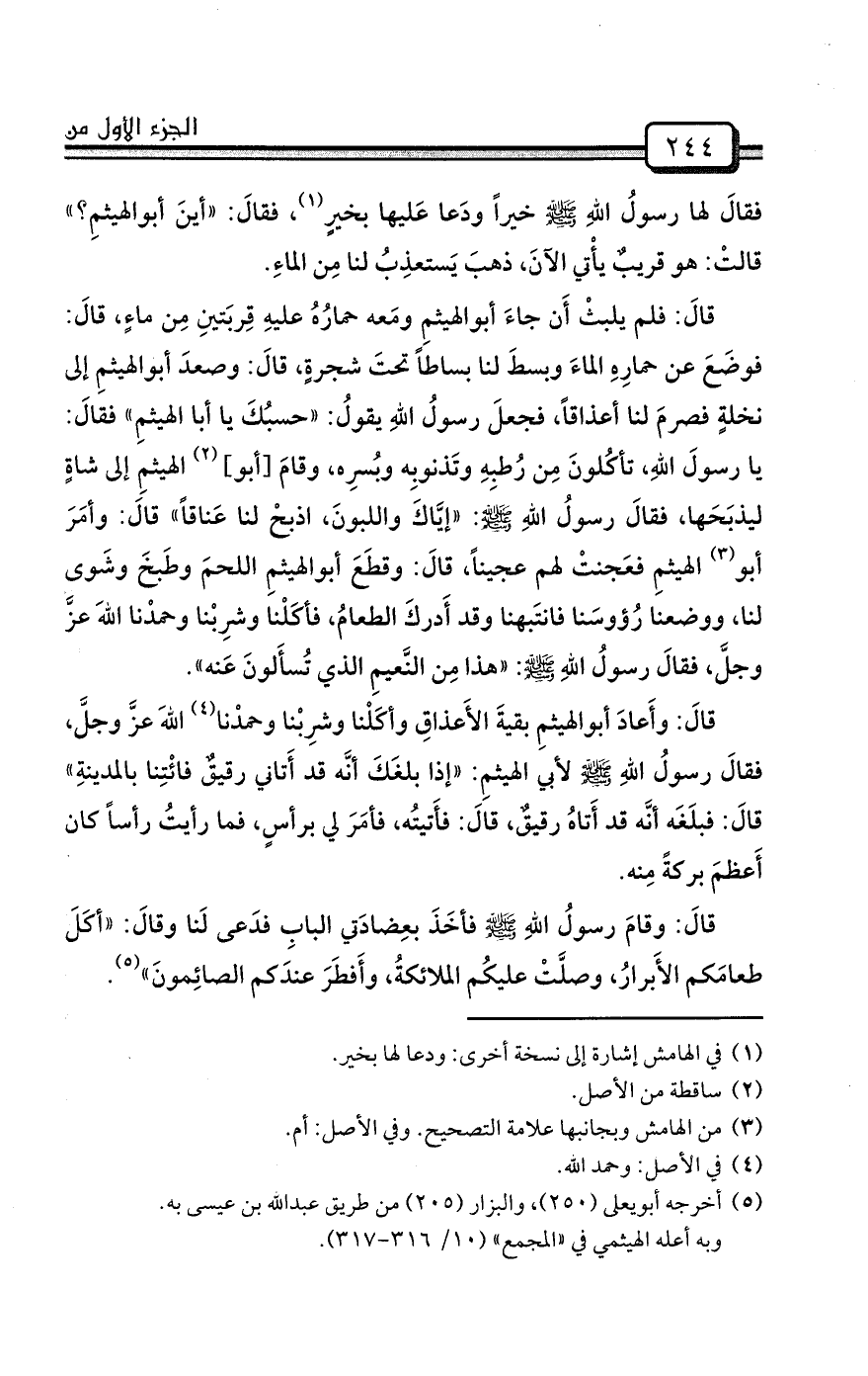 قالَ: فلم يلبثْ أَن جاءَ أبوالهيثمِ ومَعه حمارُهُ عليهِ قِربَتينِ مِن ماءٍ، قالَ: فوضَعَ عن حمارِهِ الماءَ وبسطَ لنا بساطاً تحتَ شجرةٍ، قالَ: وصعدَ أبوالهيثمِ إلى نخلةٍ فصرمَ لنا أعذاقاً، فجعلَ رسولُ اللهِ يقولُ: «حسبُكَ يا أبا الهيثمِ» فقالَ: يا رسولَ اللهِ، تأكُلونَ مِن رُطبِهِ وتَذنوبِه وبُسرِه، وقامَ [أبو] (¬2) الهيثمِ إلى شاةٍ ليذبَحَها، فقالَ رسولُ اللهِ صلى الله عليه وسلم: «إيَّاكَ واللبونَ، اذبحْ لنا عَناقاً» قالَ: وأمَرَ أبو (¬3) الهيثمِ فعَجنتْ لهم عجيناً، قالَ: وقطَعَ أبوالهيثمِ اللحمَ وطَبخَ وشَوى لنا، ووضعنا رُؤوسَنا فانتَبهنا وقد أَدركَ الطعامُ، فأكَلْنا وشرِبْنا وحمدْنا اللهَ عزَّ وجلَّ، فقالَ رسولُ اللهِ صلى الله عليه وسلم: «هذا مِن النَّعيمِ الذي تُسأَلونَ عَنه» .