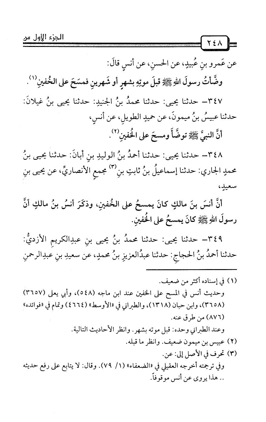 وحديث أنس في المسح على الخفين عند ابن ماجه (548) ، وأبي يعلى (3657) (3658) ، وابن حبان (1318) ، والطبراني في «الأوسط» (4664) وتمام في «فوائده» (876) من طرق عنه.