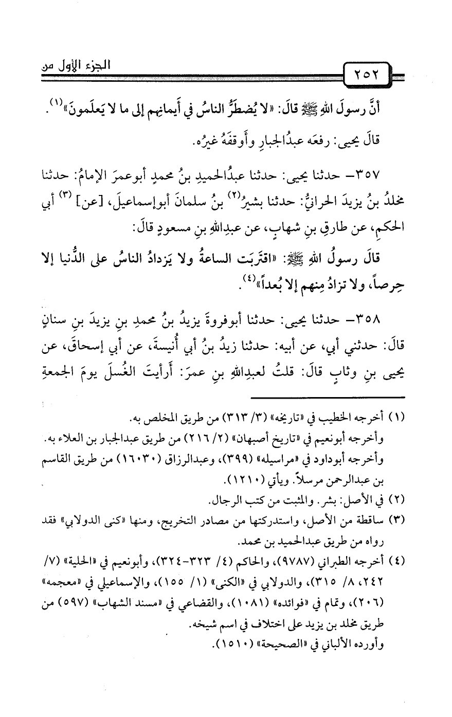 357- حدثنا يحيى: حدثنا عبدُالحميدِ بنُ محمدٍ أبوعمرَ الإمامُ: حدثنا مخلدُ بنُ يزيدَ الحرانيُّ: حدثنا بشيرُ (¬2) بنُ سلمانَ أبوإسماعيلَ، [عن] (¬3) أبي الحكمِ، عن طارقِ بنِ شهابٍ، عن عبدِاللهِ بنِ مسعودٍ قالَ: