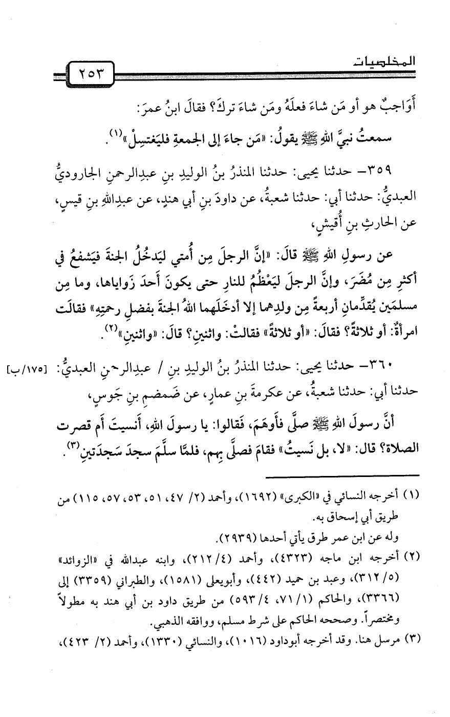 360- حدثنا يحيى: حدثنا المنذرُ بنُ الوليدِ بنِ / عبدِالرحمنِ العبديُّ: حدثنا أبي: حدثنا شعبةُ، عن عكرمةَ بنِ عمارٍ، عن ضَمضمِ بنِ جَوسٍ،