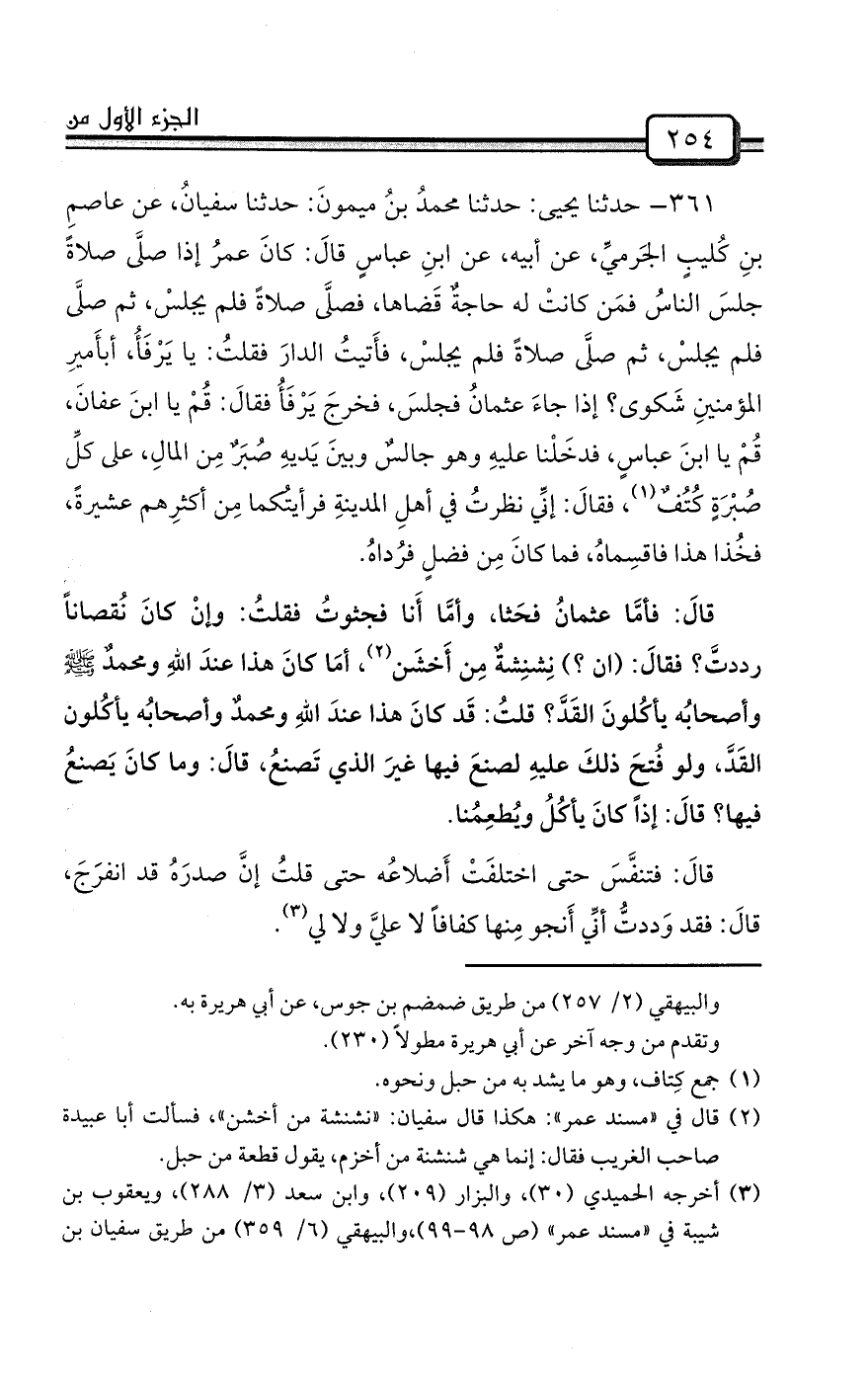 361- حدثنا يحيى: حدثنا محمدُ بنُ ميمونَ: حدثنا سفيانُ، عن عاصمِ بنِ كُليبٍ الجَرميِّ، عن أبيه، عن ابنِ عباسٍ قالَ: كانَ عمرُ إذا صلَّى صلاةً جلسَ الناسُ فمَن كانتْ له حاجةٌ قَضاها، فصلَّى صلاةً فلم يجلسْ، ثم صلَّى فلم يجلسْ، ثم صلَّى صلاةً فلم يجلسْ، فأَتيتُ الدارَ فقلتُ: يا يَرْفَأُ، أبأَميرِ المؤمنينِ شَكوى؟ إذا جاءَ عثمانُ فجلسَ، فخرجَ يَرْفَأُ فقالَ: قُمْ يا ابنَ عفانَ، قُمْ يا ابنَ عباسٍ، فدخَلْنا عليهِ وهو جالسٌ وبينَ يَديهِ صُبَرٌ مِن المالِ، على كلِّ صُبْرَةٍ كُتُفٌ (¬1) ، فقالَ: إنِّي نظرتُ في أهلِ المدينةِ فرأيتُكما مِن أكثرِهم عشيرةً، فخُذا هذا فاقسِماهُ، فما كانَ مِن فضلٍ فرُداهُ.