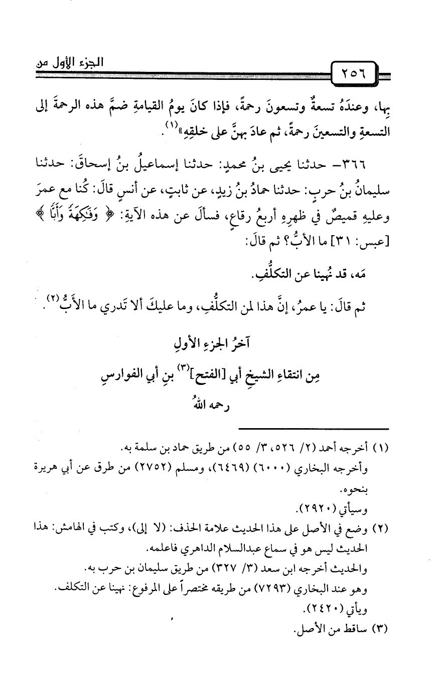 366- حدثنا يحيى بنُ محمدٍ: حدثنا إسماعيلُ بنُ إسحاقَ: حدثنا سليمانُ بنُ حربٍ: حدثنا حمادُ بنُ زيدٍ، عن ثابتٍ، عن أنسٍ قالَ: كُنا مع عمرَ وعليهِ قميصٌ في ظهرِهِ أربعُ رقاعٍ، فسألَ عن هذه الآيةِ: {وَفَاكِهَةً وَأَبًّا} [عبس: 31] ما الأبُّ؟ ثم قالَ: