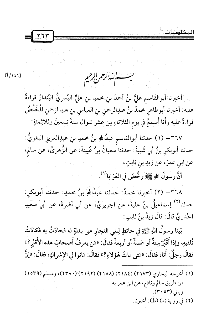 367- (1) حدثنا أبوالقاسمِ عبدُاللهِ بنُ محمدِ بنِ عبدِالعزيزِ البغويُّ: حدثنا أبوبكرِ بنُ أبي شَيبةَ: حدثنا سفيانُ بنُ عُيينةَ: عن الزُّهريِّ، عن سالمٍ، عن ابنِ عمرَ، عن زيدِ بنِ ثابتٍ،