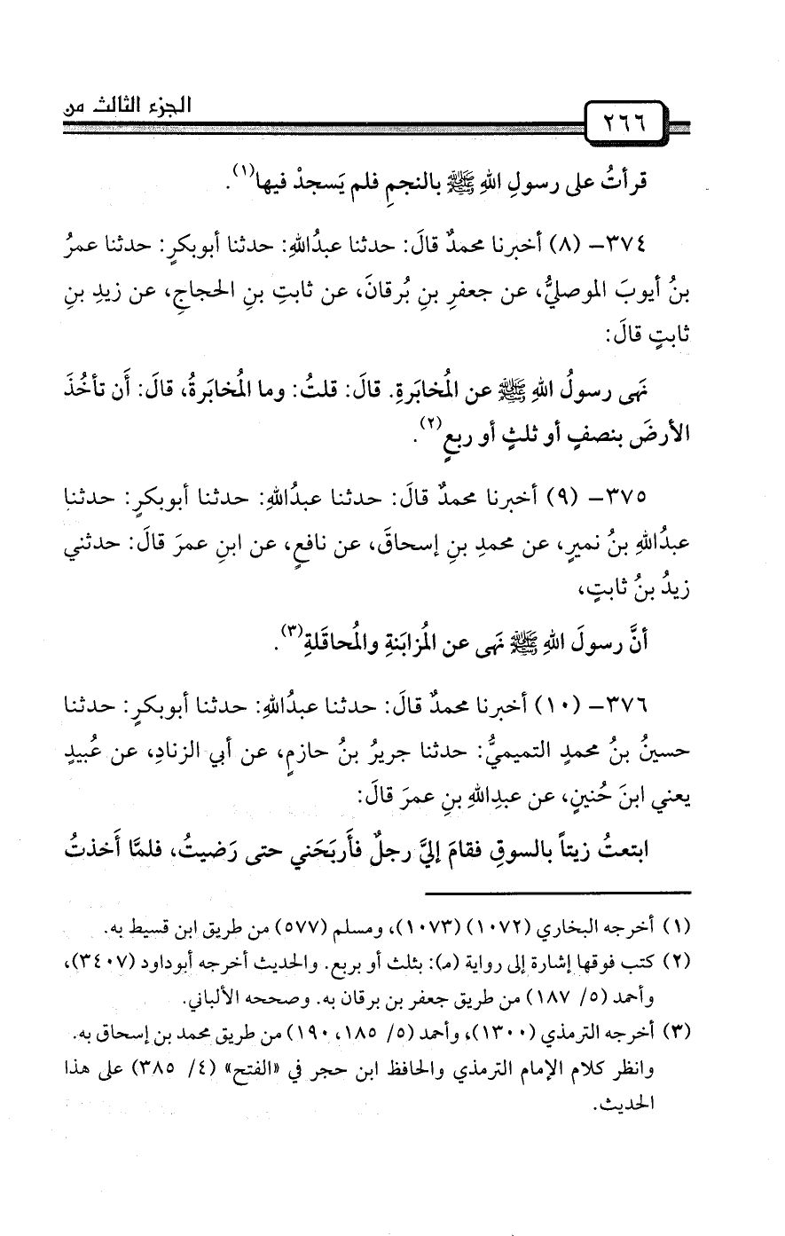 375- (9) أخبرنا محمدٌ قالَ: حدثنا عبدُاللهِ: حدثنا أبوبكرٍ: حدثنا عبدُاللهِ بنُ نميرٍ، عن محمدِ بنِ إسحاقَ، عن نافعٍ، عن ابنِ عمرَ قالَ: حدثني زيدُ بنُ ثابتٍ،