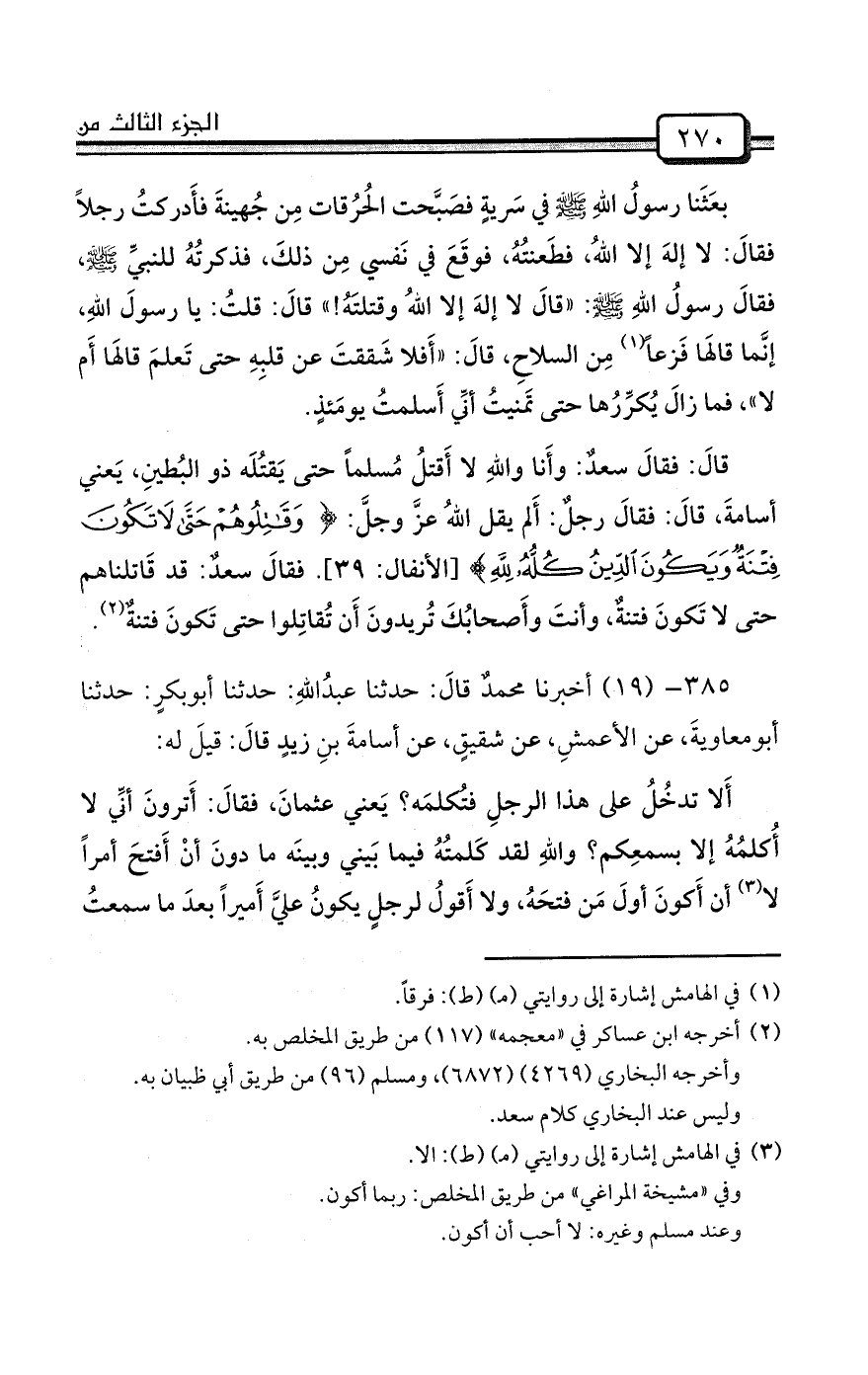 385- (19) أخبرنا محمدٌ قالَ: حدثنا عبدُاللهِ: حدثنا أبوبكرٍ: حدثنا أبومعاويةَ، عن الأعمشِ، عن شقيقٍ، عن أسامةَ بنِ زيدٍ قالَ: قيلَ له: