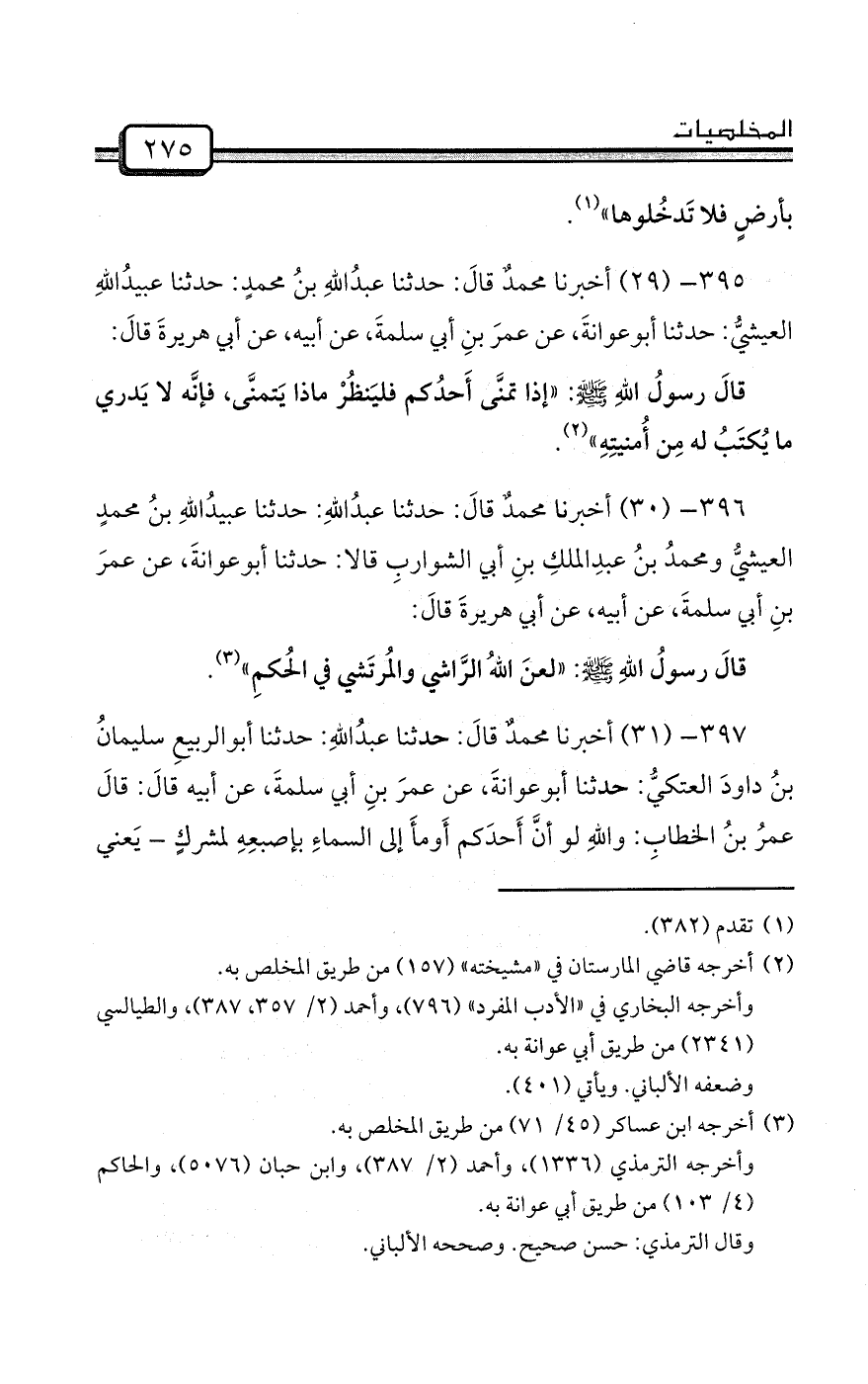 397- (31) أخبرنا محمدٌ قالَ: حدثنا عبدُاللهِ: حدثنا أبوالربيعِ سليمانُ بنُ داودَ العتكيُّ: حدثنا أبوعوانةَ، عن عمرَ بنِ أبي سلمةَ، عن أبيه قالَ: قالَ عمرُ بنُ الخطابِ: واللهِ لو أنَّ أَحدَكم أَومأَ إلى السماءِ بإصبعِهِ لمشركٍ - يَعني