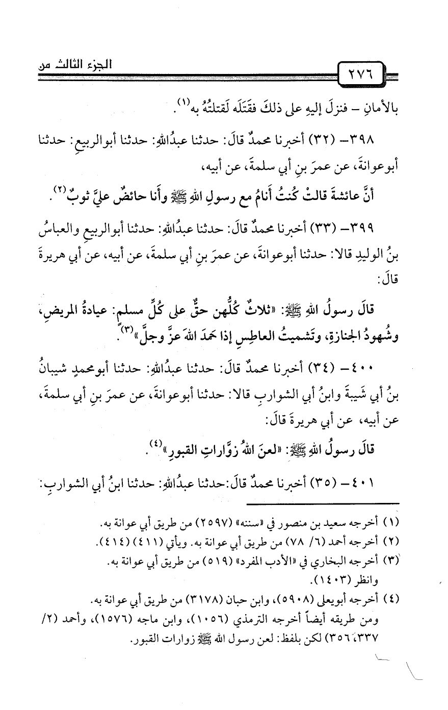 399- (33) أخبرنا محمدٌ قالَ: حدثنا عبدُاللهِ: حدثنا أبوالربيعِ والعباسُ بنُ الوليدِ قالا: حدثنا أبوعوانةَ، عن عمرَ بنِ أبي سلمةَ، عن أبيه، عن أبي هريرةَ قالَ:
