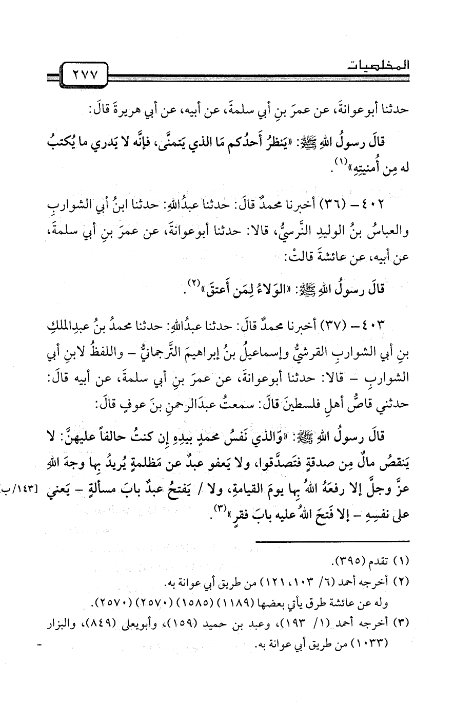 403- (37) أخبرنا محمدٌ قالَ: حدثنا عبدُاللهِ: حدثنا محمدُ بنُ عبدِالملكِ بنِ أبي الشواربِ القرشيُّ وإسماعيلُ بنُ إبراهيمَ التَّرجمانيُّ - واللفظُ لابنِ أبي الشواربِ - قالا: حدثنا أبوعوانةَ، عن عمرَ بنِ أبي سلمةَ، عن أبيه قالَ: حدثني قاصُّ أهلِ فلسطينَ قالَ: سمعتُ عبدَالرحمنِ بنَ عوفٍ قالَ: