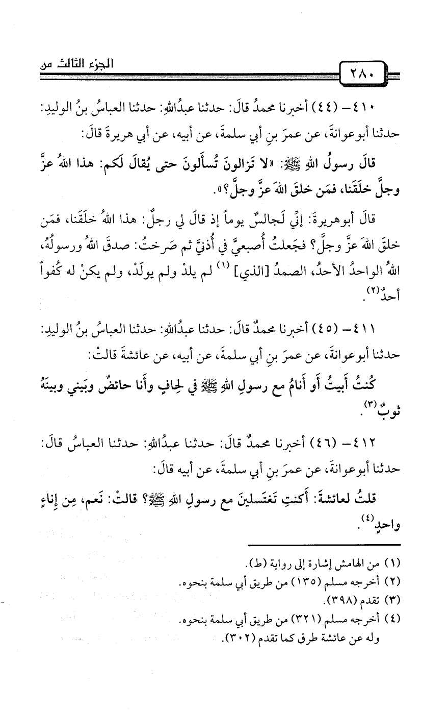 410- (44) أخبرنا محمدُ قالَ: حدثنا عبدُاللهِ: حدثنا العباسُ بنُ الوليدِ: حدثنا أبوعوانةَ، عن عمرَ بنِ أبي سلمةَ، عن أبيه، عن أبي هريرةَ قالَ: