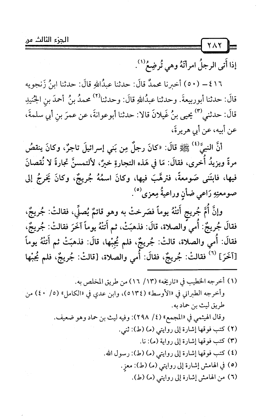 وإنَّ أُمَّ جُريجٍ أَتتْهُ يوماً فصَرختْ به وهو قائمٌ يُصلِّي، فقالتْ: جُريجٌ، فقالَ جُريجٌ: أُمي والصلاة، قالَ: فذهبَتْ، ثم أَتتْهُ يوماً آخَرَ فقالتْ: جُريجٌ، فقالَ: أُمي والصلاة، قالتْ: جُريجٌ، فلم يُجِبْها، قالَ: فذهبَتْ ثم أَتتْهُ يوماً [آخَرَ] (¬6) فقالتْ: جُريجٌ، فقالَ: أُمي والصلاة، [قالتْ: جُريجٌ، فلم يُجبْها