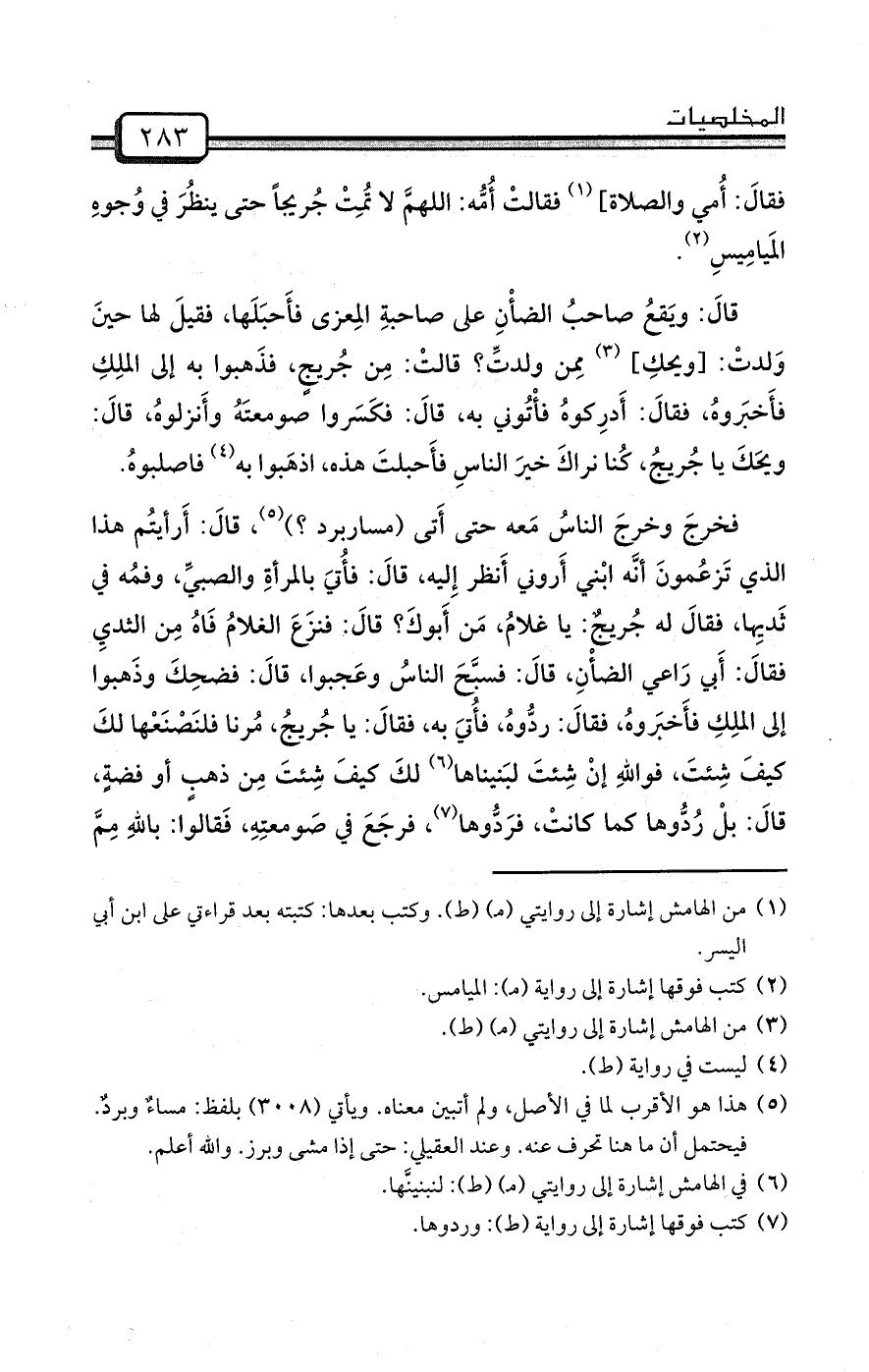 فخرجَ وخرجَ الناسُ مَعه حتى أَتى (مساربرد؟) (¬5) ، قالَ: أَرأيتُم هذا الذي تَزعُمونَ أنَّه ابْني أَروني أَنظر إِليه، قالَ: فأُتيَ بالمرأةِ والصبيِّ، وفمُه في ثَديِها، فقالَ له جُريجٌ: يا غلامُ، مَن أَبوكَ؟ قالَ: فنزَعَ الغلامُ فَاهُ مِن الثديِ فقالَ: أَبي رَاعي الضأْنِ، قالَ: فسبَّحَ الناسُ وعَجبوا، قالَ: فضحِكَ وذَهبوا إلى الملِكِ فأَخبَروهُ، فقالَ: ردُّوهُ، فأُتيَ به، فقالَ: يا جُريجُ، مُرنا فلنَصْنَعْها لكَ كيفَ شِئتَ، فواللهِ إنْ شِئتَ لبَنيناها (¬6) لكَ كيفَ شِئتَ مِن ذهبٍ أو فضةٍ، قالَ: بلْ رُدُّوها كما كانتْ، فرَدُّوها (¬7) ، فرجَعَ في صَومعتِهِ، فَقالوا: باللهِ مِمَّ