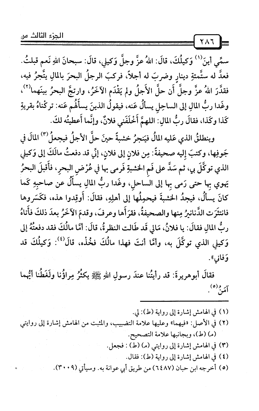 وينطلقُ الذي عَليه المالُ فيَنجرُ خشبةً حينَ حلَّ الأجلُ فيجعلُ (¬3) المالَ في جَوفِها، وكتبَ إِليه صحيفةً: مِن فلانٍ إلى فلانٍ، إنِّي قد دفعتُ مالَكَ إلى وَكيلي الذي توكَّلَ بي، ثم سَدَّ على فَمِ الخشبةِ فَرمى بها في عُرْضِ البحرِ، فأَقبلَ البحرُ يَهوي بِها حتى رَمى بِها إلى الساحلِ، وغَدا ربُّ المالِ يسأَلُ عن صاحبِهِ كَما كانَ يسألُ، فيجدُ الخشبةَ فيحمِلُها إلى أهلِهِ، فقالَ: أَوقِدوا هذه، فكَسَروها فانتثَرَت الدَّنانيرُ مِنها والصحيفةُ، فقرَأَها وعرفَ، وقدمَ الآخَرُ بعدَ ذلكَ فأَتاهُ ربُّ المالِ فقالَ: يا فلانُ، مَالي قَد طَالت النظرةُ، قالَ: أمَّا مالُكَ فقد دفعتُهُ إلى وَكيلي الذي توكَّلَ به، وأمَّا أنتَ فهذا مالُكَ فخُذْه، قالَ (¬4) : وَكيلُكَ قد وَفاني» .