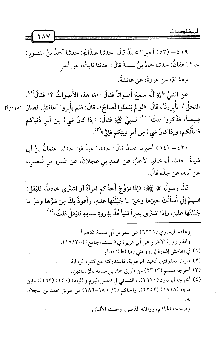 419- (53) أخبرنا محمدٌ قالَ: حدثنا عبدُاللهِ: حدثنا أحمدُ بنُ منصورٍ: حدثنا عفانُ: حدثنا حمادُ بنُ سلمةَ قالَ: حدثنا ثابتٌ، عن أنسٍ.