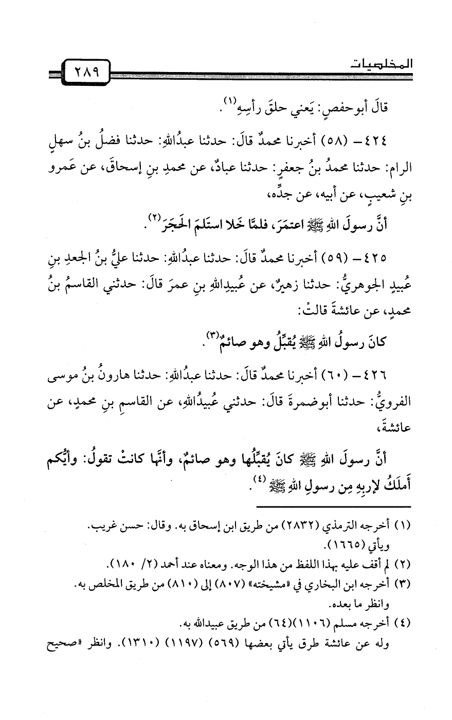 424- (58) أخبرنا محمدٌ قالَ: حدثنا عبدُاللهِ: حدثنا فضلُ بنُ سهلٍ الرام: حدثنا محمدُ بنُ جعفرٍ: حدثنا عبادٌ، عن محمدِ بنِ إسحاقَ، عن عَمرو بنِ شعيبٍ، عن أبيه، عن جدِّه،